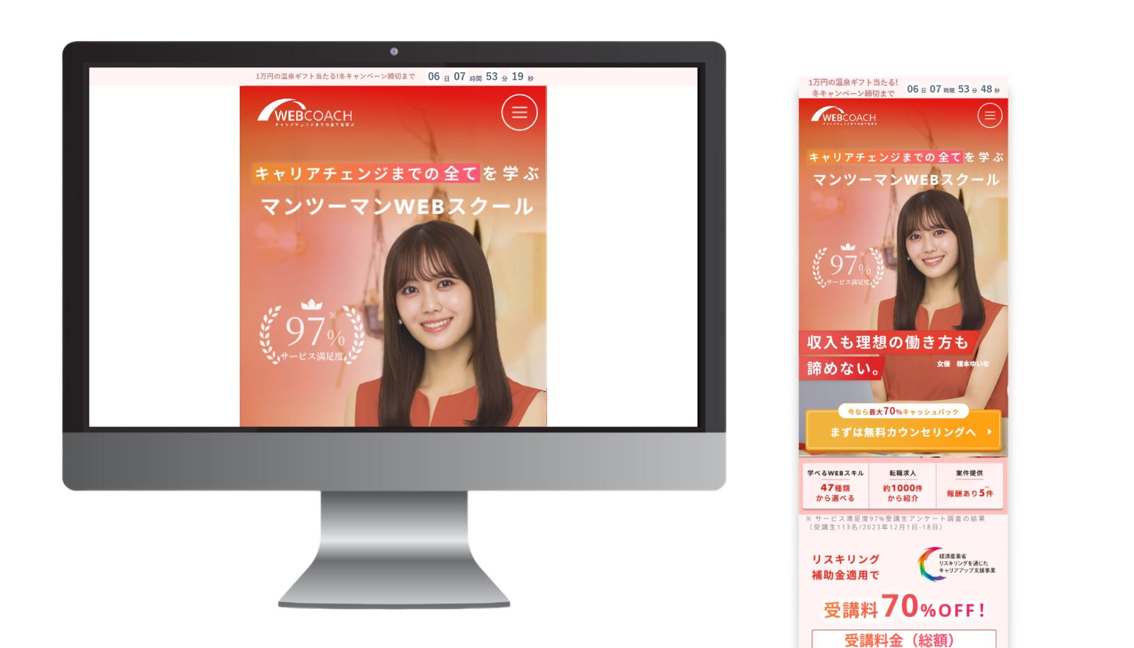 WEBCOACHは、キャリアチェンジまでの全てを学び理想の❝収入と働き方❞、どちらも叶えるためのマンツーマンWEBスクールです。